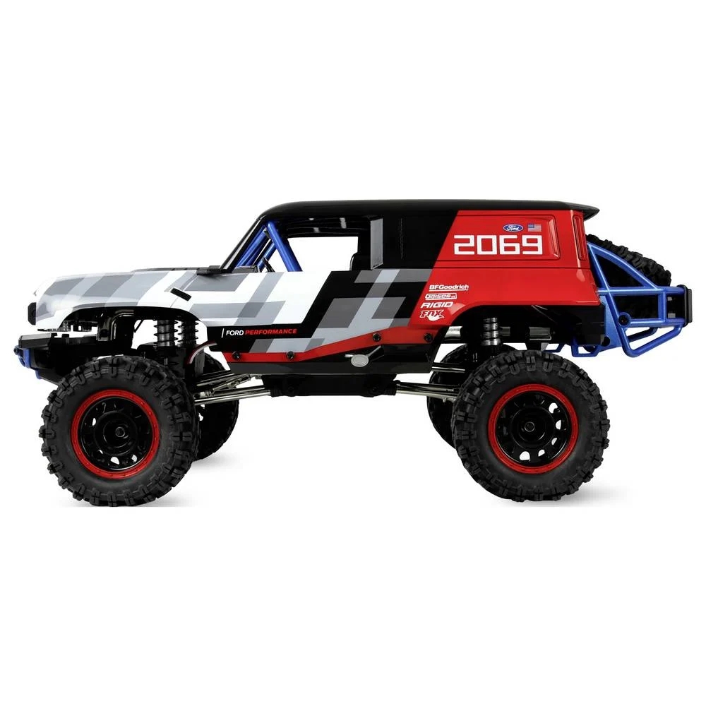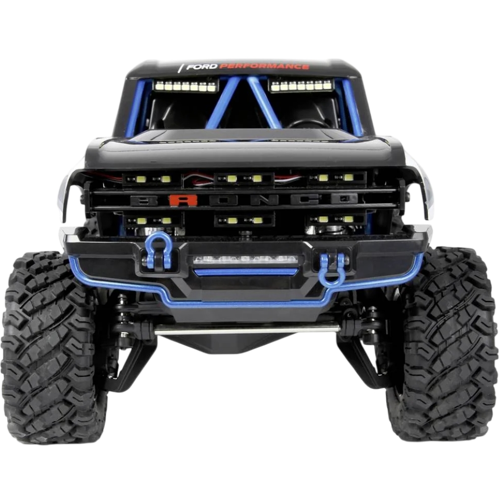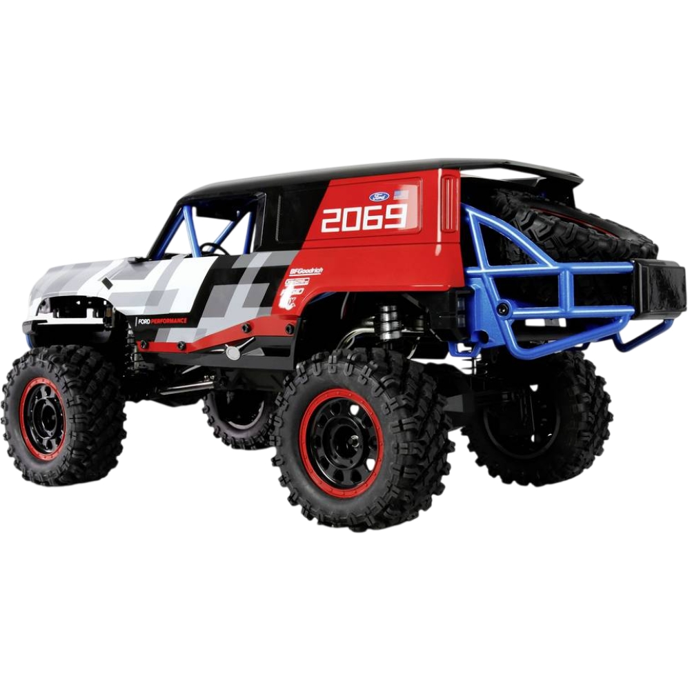 Das RTR-Set (Ready-to-Run) wird inklusive Fernsteuerung, Akku und Ladekabel geliefert und ist sofort einsatzbereit. Die Karosserie im lizenzierten Ford Bronco R Baja 1000 Design besteht aus strapazierfähigem ABS-Kunststoff und ist mit einem robusten Kunststoffkäfig sowie einem praktischen Magnetverschluss ausgestattet. Eine wasserdichte Empfängerbox schützt die Elektronik zuverlässig vor Feuchtigkeit. Für optimale Dämpfung sorgen Öldruck-Stoßdämpfer.