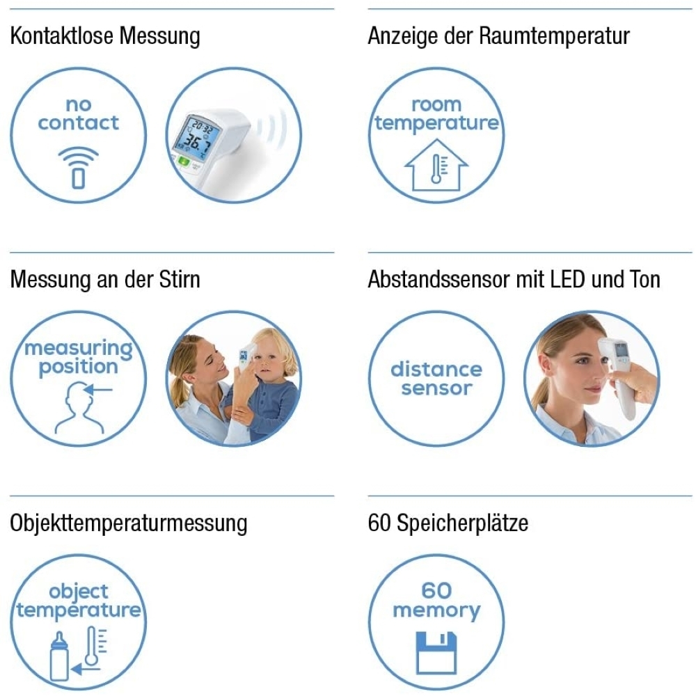Das Thermometer speichert die Temperatur automatisch. Die Werte der letzten 60 Messungen von jeweils Körper- und Objekttemperatur werden dabei gespeichert. Durch die Speicherplätze können Sie die Entwicklung der Temperatur über mehrere Messungen hinweg verfolgen.