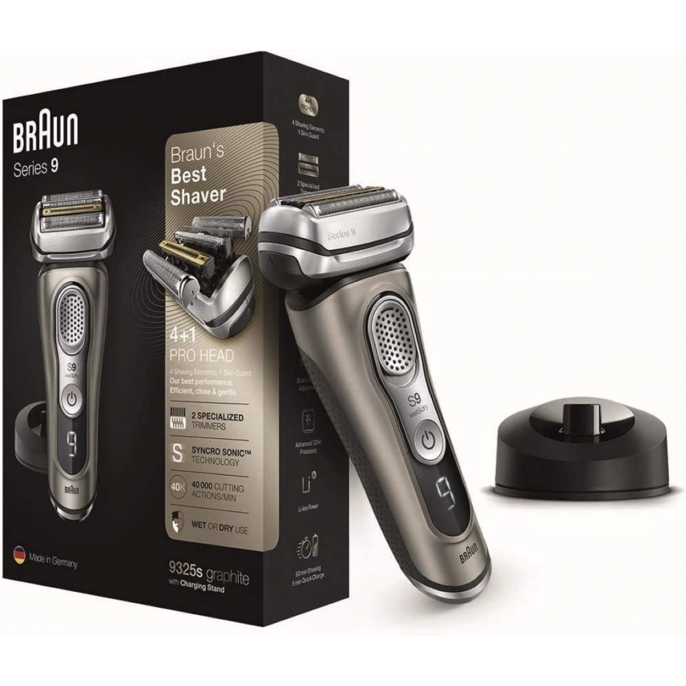 Brauns Premium Rasierer mit 4+1 Scherkopf. Effizient. Gründlich. Angenehm zur Haut. Deutschlands Nr. Effizient und sanft. Egal ob 1-, 3- oder 7-Tage Bart. Der Präzisionsscherkopf bietet Ihnen eine glatte und gleichzeitig sanfte Rasur ohne Kompromisse. Der Elektrorasierer für Herren gleitet sanft über die Haut und eignet sich für die Nass- und Trockenrasur. 60 Minuten Akkulaufzeit dank Lithium-Ionen-Akku. Eine Schnellladung von 5 Minuten reicht für eine Rasur. Inklusive Ladestation. Produkt vom GQ Magazin empfohlen.Modellnummer: 9325sIm Lieferumfang enthalten: 1x Rasierapparat1x Ladestation1x Stoff-Reise-Etui1x Netzteil1x Reinigungsbürste