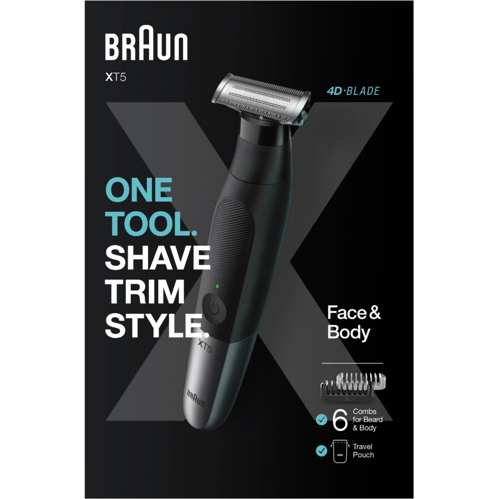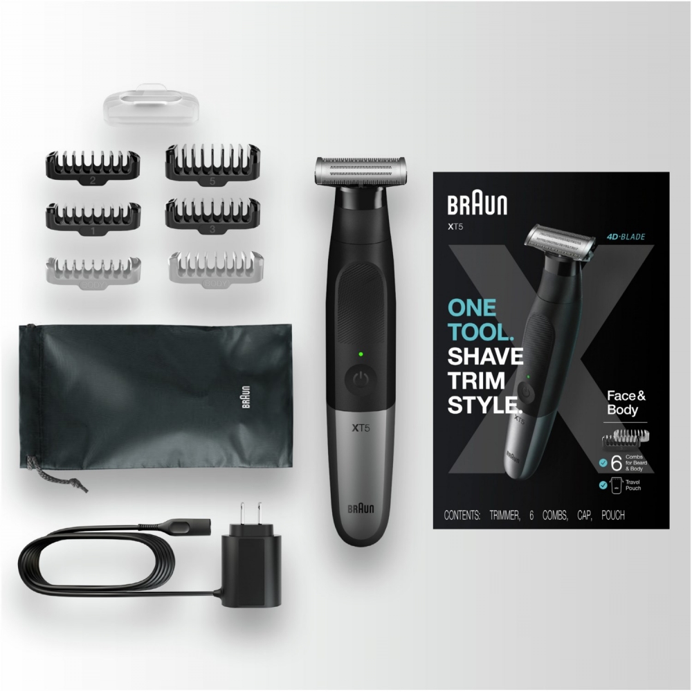 Der Braun Series XT5 ist ein Barttrimmer, Bodygroomer und Elektrorasierer für Herren – alles in einem Gerät. Die 4D-Klinge sorgt für eine einfache und komfortable Rasur, die gleichzeitig sanft zur Haut ist. Der Trimmer und Rasierer ist zu 100% wasserdicht und kann nass oder trocken verwendet werden.