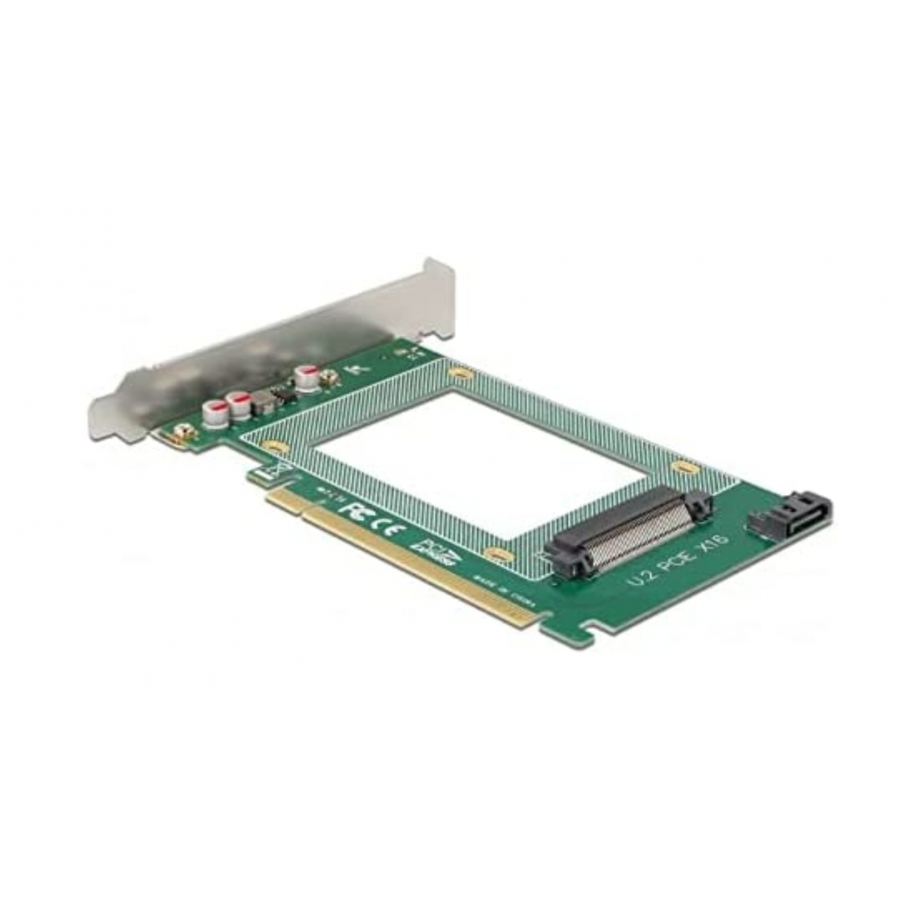 Diese PCI Express Karte von Delock erweitert den PC um einen U.2 Anschluss. An diesen kann eine U.2 SSD, im 2.5″ Format, angeschlossen werden. Außerdem ist es möglich, eine 2.5″ SSD / HDD anzuschließen und via dem SATA Anschluss mit dem Mainboard zu verbinden.