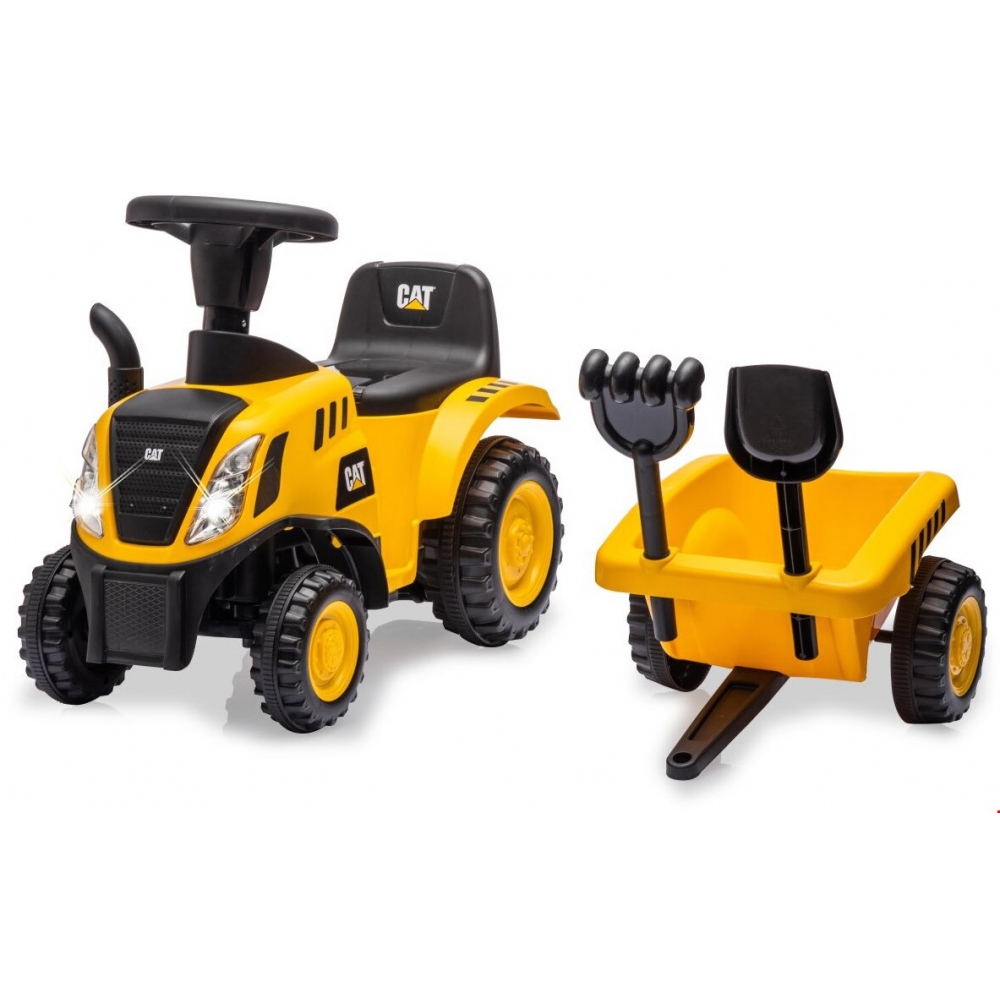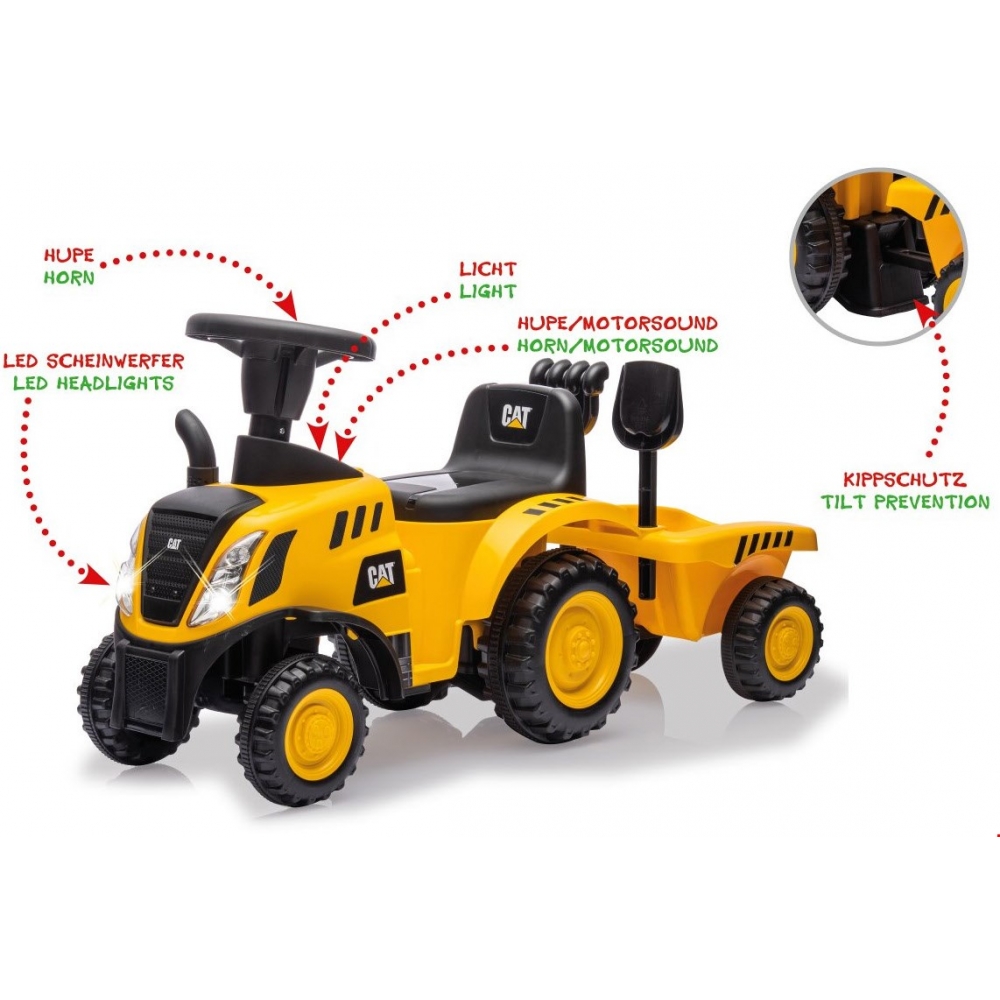 Wer kennt sie nicht, die weltweit führende Landmaschinenmarke für Traktoren? Der Rutscher Caterpillar Traktor mit Anhänger in auffälligem Gelb ist nicht nur offiziell lizenziert, sondern auch ein echtes Highlight für kleine Landwirte. Mit seiner originalgetreuen Optik und vielen großartigen Funktionen wird er jedes Kinderherz höherschlagen lassen. Der Traktor ist mit echten Scheinwerfern ausgestattet, die ihn auch bei Dämmerung zum Strahlen bringen. Die Hupe am Lenkrad und der Motorsound, die beide per Knopfdruck aktiviert werden, sorgen für eine noch realistischere Fahrt. Dank des Kippschutzes ist stets für Sicherheit gesorgt, und der praktische Kofferraum unter dem abnehmbaren Sitz, bietet Platz für all die kleinen Spielsachen, die auf den Ausflügen mitgenommen werden müssen. Der Anhänger kommt mit einem integrierten Gerätehalter, einer Schaufel und einem Handrechen, sodass der Traktor noch mehr Möglichkeiten zum Spielen bietet. Der Sitz ist abnehmbar, um das Fahrerlebnis noch individueller zu gestalten. Mit dem Rutscher Caterpillar Traktor können die Kleinen ihre Fantasie voll entfalten – und das immer mit einem sicheren Gefühl!