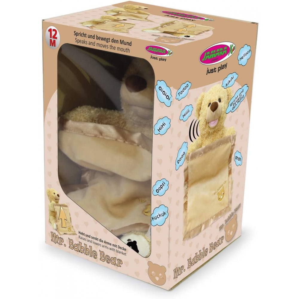 Mit Mr. Babble Bär kommt ein flauschiger Spielgefährte zu den Kleinsten in die Kinderzimmer. Der süße Bär mit seinem weichen Fell spielt mit seiner Decke ein lustiges Versteckspiel in dem er die Decke mit seinen Armen hoch und runter bewegt. Der plüschige Stoffbär spricht mit seinem liebvollen Gesicht zu den kleinen Spielgefährten niedliche Geräusche und bewegt dabei seinen Mund. Dieser samtweiche Freund wird ihnen dabei sofort ans Herz wachsen.