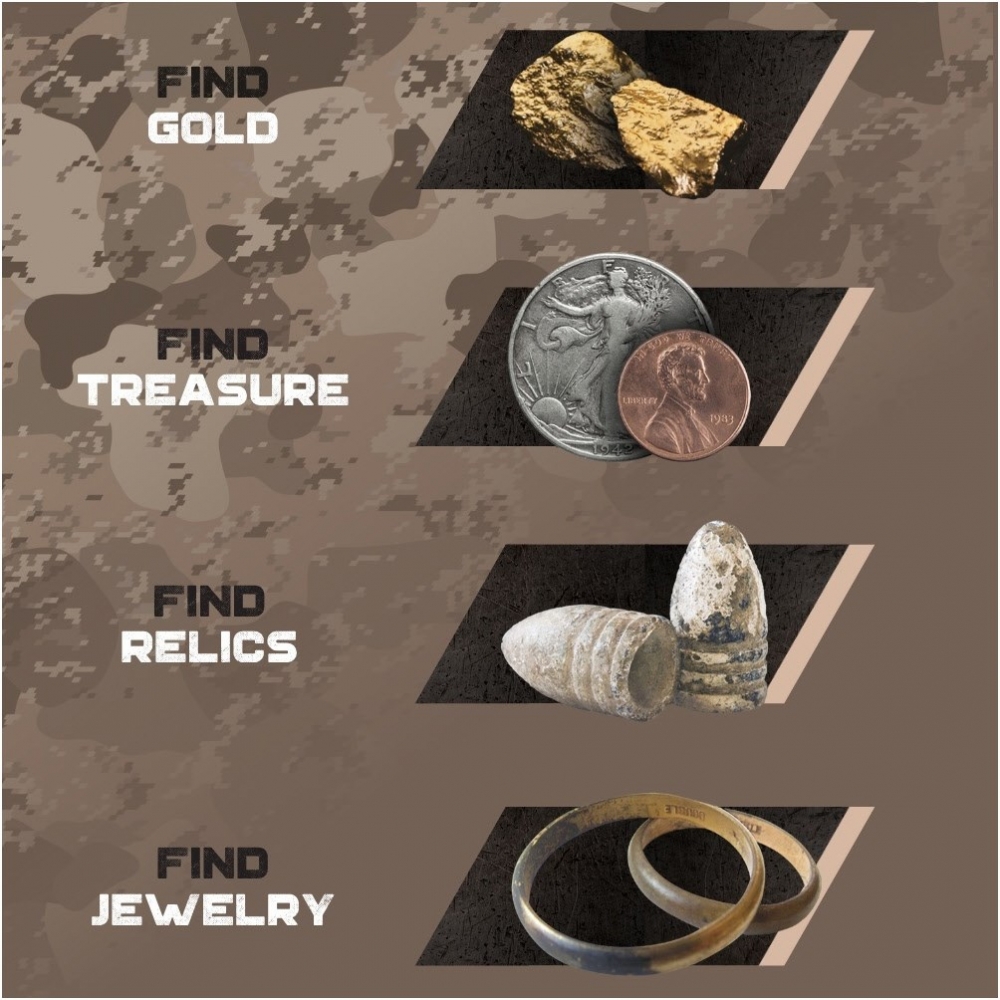 Wechseln Sie zwischen vier Jagdkürzeln, um Ihren Detektor auf bestimmte Arten von Schätzen abzustimmen. Schalten Sie auf Pinpoint um, um eine Entdeckung mit noch größerer Präzision zu finden.