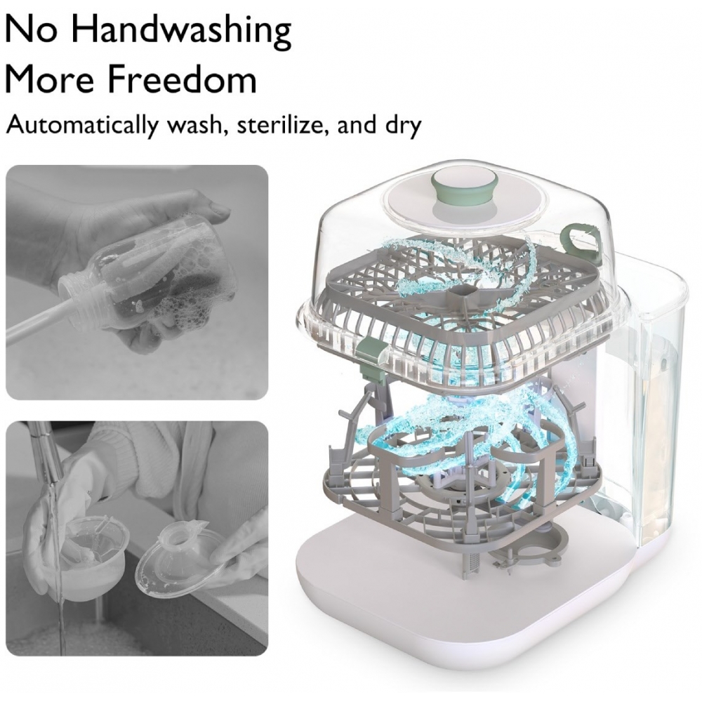 Wäscht, sterilisiert und trocknet Babyflaschen, Milchpumpenteile und Geschirr vollautomatisch, sodass Sie mehr Zeit für Ihr Baby haben.