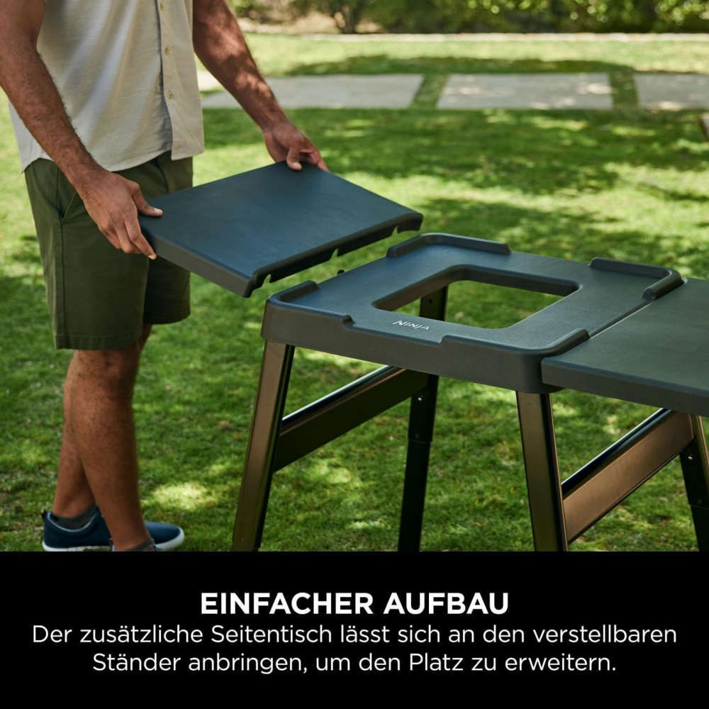 Dieser Beistelltisch kann an beiden Seiten Ihres verstellbaren Ninja Woodfire-Ständers befestigt werden.