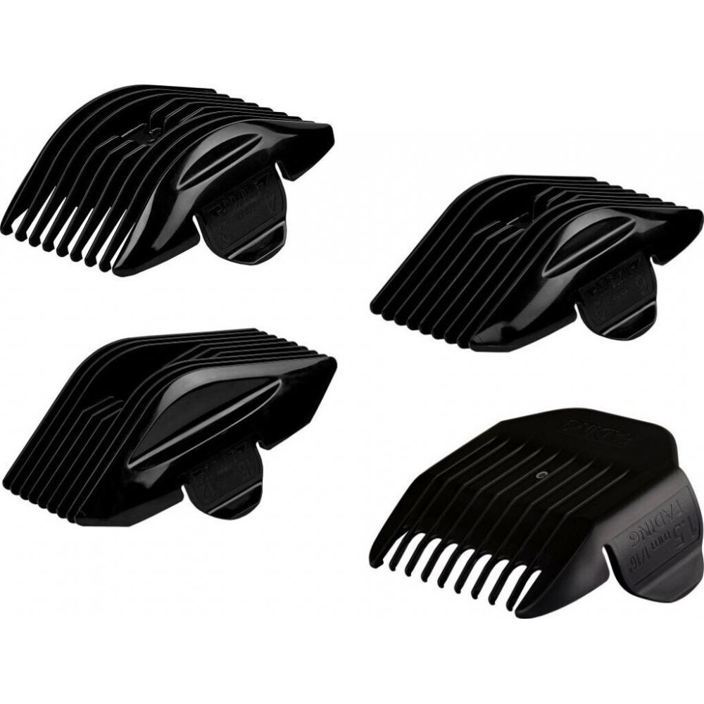 Die vier Kammaufsätze ermöglichen es Ihnen, verschiedenste Haarlängen zu schneiden (Fading 1,5 - 2,7 mm, 3/4 mm, 6/9 mm, 12/15 mm). Die Kammaufsätze werden mit einer speziellen Halterung zur sauberen Aufbewahrung geliefert.