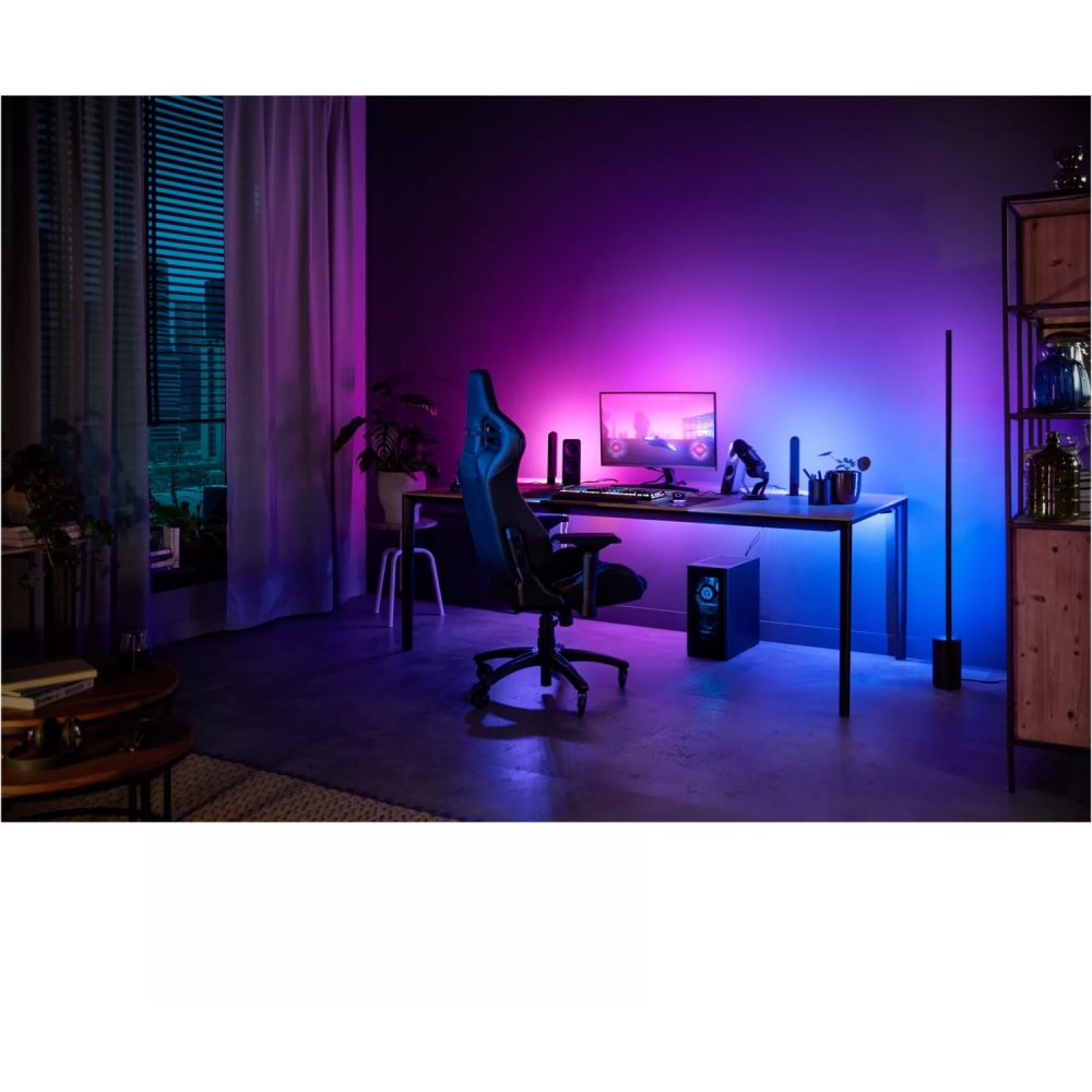 Mit dem Hue Play Gradient Lightstrip für PC (24-27") kommt effektvolle Beleuchtung in das heimische PC-Setup. Dieser LED-Streifen wird hinter einem Monitor mit einer Diagonale von 24-27" befestigt und projiziert dann farbiges oder weißes Licht auf die Wand dahinter. Die Farbverschmelzung an der Wand erzeugt dabei einen einzigarten Lichteffekt, der per App steuerbar und mit Inhalten auf dem Monitor synchronisierbar ist. Dabei kann der Lightstrip natürlich auch in eine bereits bestehende Hue-Installation integriert werden. So entsteht eine effektvolle Beleuchtungsumgebung für Gaming und Entertainment. Im Lieferumfang dieses Starter-Kits ist neben dem LED-Streifen auch eine Hue Bridge enthalten.