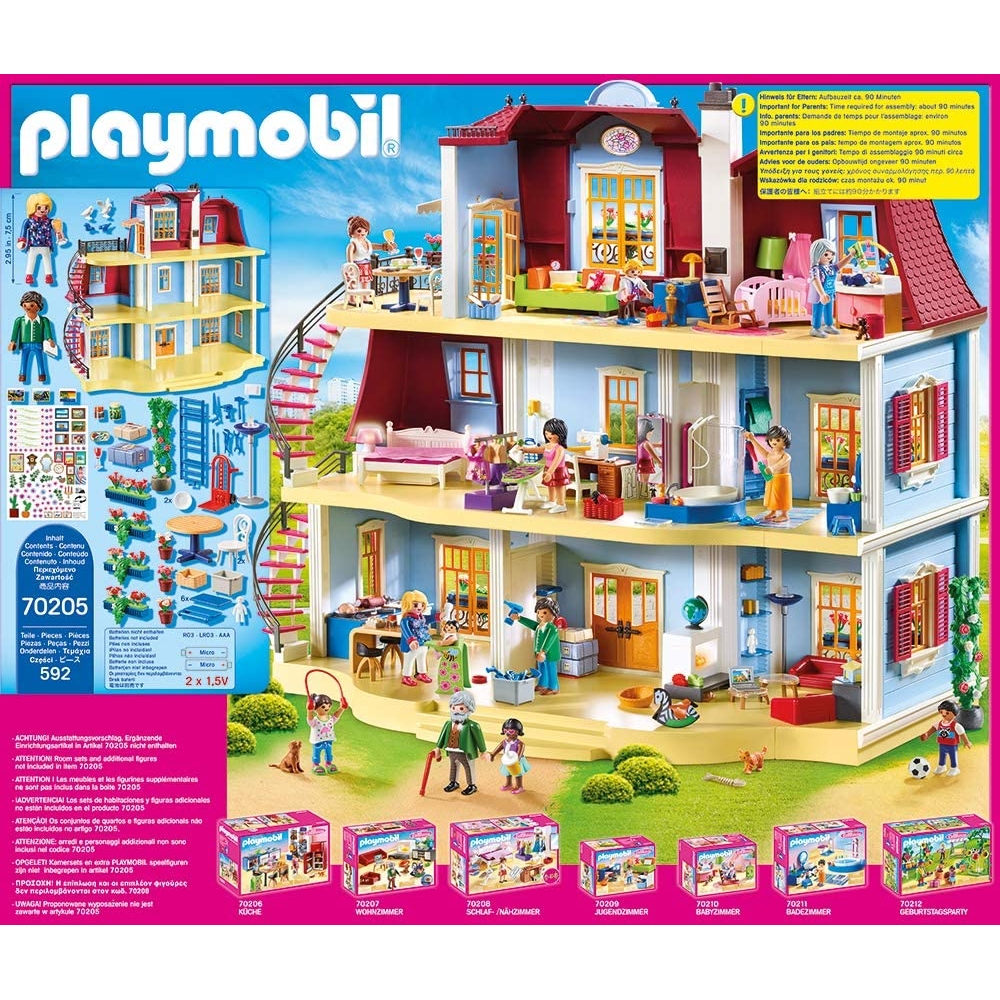 Im Neuen »Großen Puppenhaus« mit funktionierender Türklingel und Dachterrasse fühlt sich die Playmobil®- Familie pudelwohl. Über die Wendeltreppe am Haus gelangt man schnell auf die gemütliche Dachterrasse. Die liebevoll gestalteten Hausfassade ist mit Blumenkästen mit Pflanzen verziert. Im Zubehör finden sich außerdem ein Briefkasten zum Öffnen, verschiedene Möbel, ein Stickerbogen und weitere Dekoelemente.