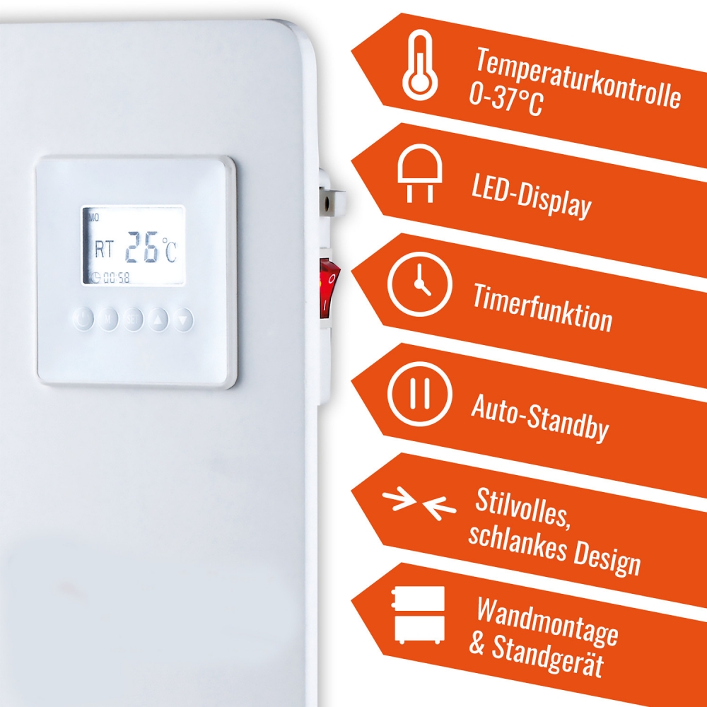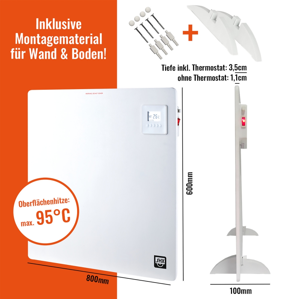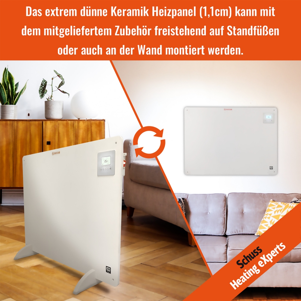 Das dünne Keramik Heizpaneel (1,1cm) kann mit dem mitgelieferten Zubehör freistehend auf Standfüßen oder auch einfach an die Wand montiert werden.
