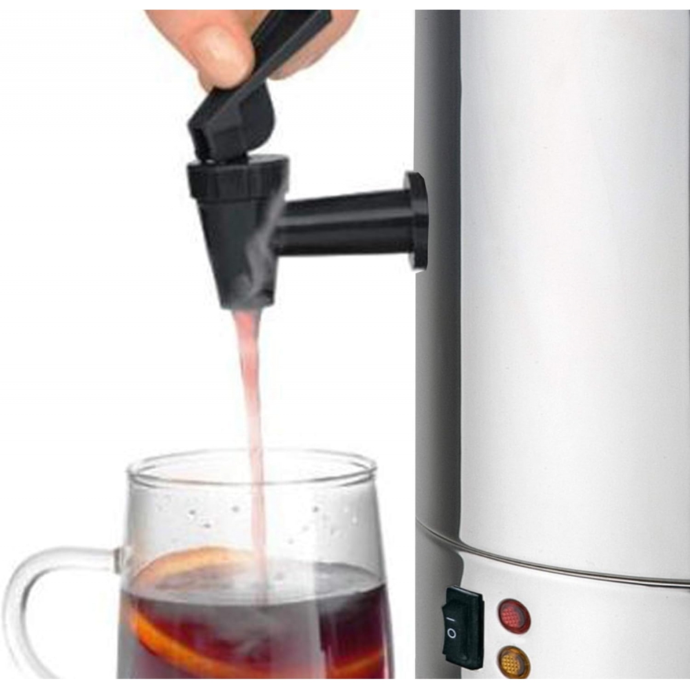 Mit diesem SILVA Homeline Getränkespender PK-HG 060 für Heißgetränke bleiben Ihre Gäste stets gut versorgt. Der Topf wartet mit ca. 6,8 Liter Nutzinhalt auf; Tee, Punsch und Co. stehen somit immer zur freien Verfügung. Dafür halten Sie einfach Ihre Tasse unter den integrierten Zapfhahn, öffnen diesen, und schon genießen Sie den Drink. Der Überhitzungsschutz gewährleistet eine sichere Handhabung.