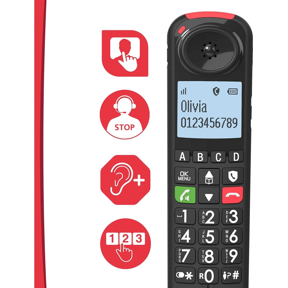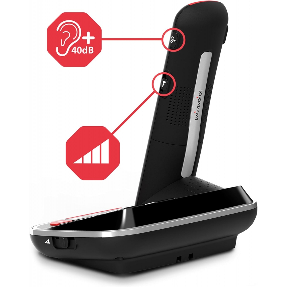 Audio-Boost um +40dB auf Tastendruck, kompatibel mit Hörgeräten, einstellbare Ruftonlautstärke bis zu 90dB und visuelle Ruftonanzeige, Klangregelung mit drei wählbaren Hörprofilen