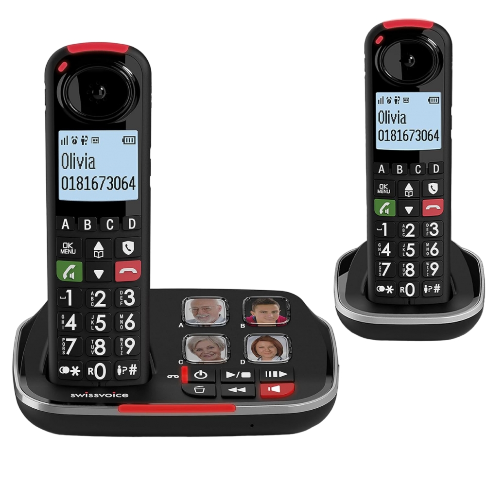 Vier programmierbare Fotodirektwahltasten, Synchrones Telefonbuch an beiden Mobilteilen für 100 Kontakte, Funktion zum Blockieren unerwünschter Rufnummern oder zum ausschließlichen Zulassen von Anrufen von VIP-Nummern