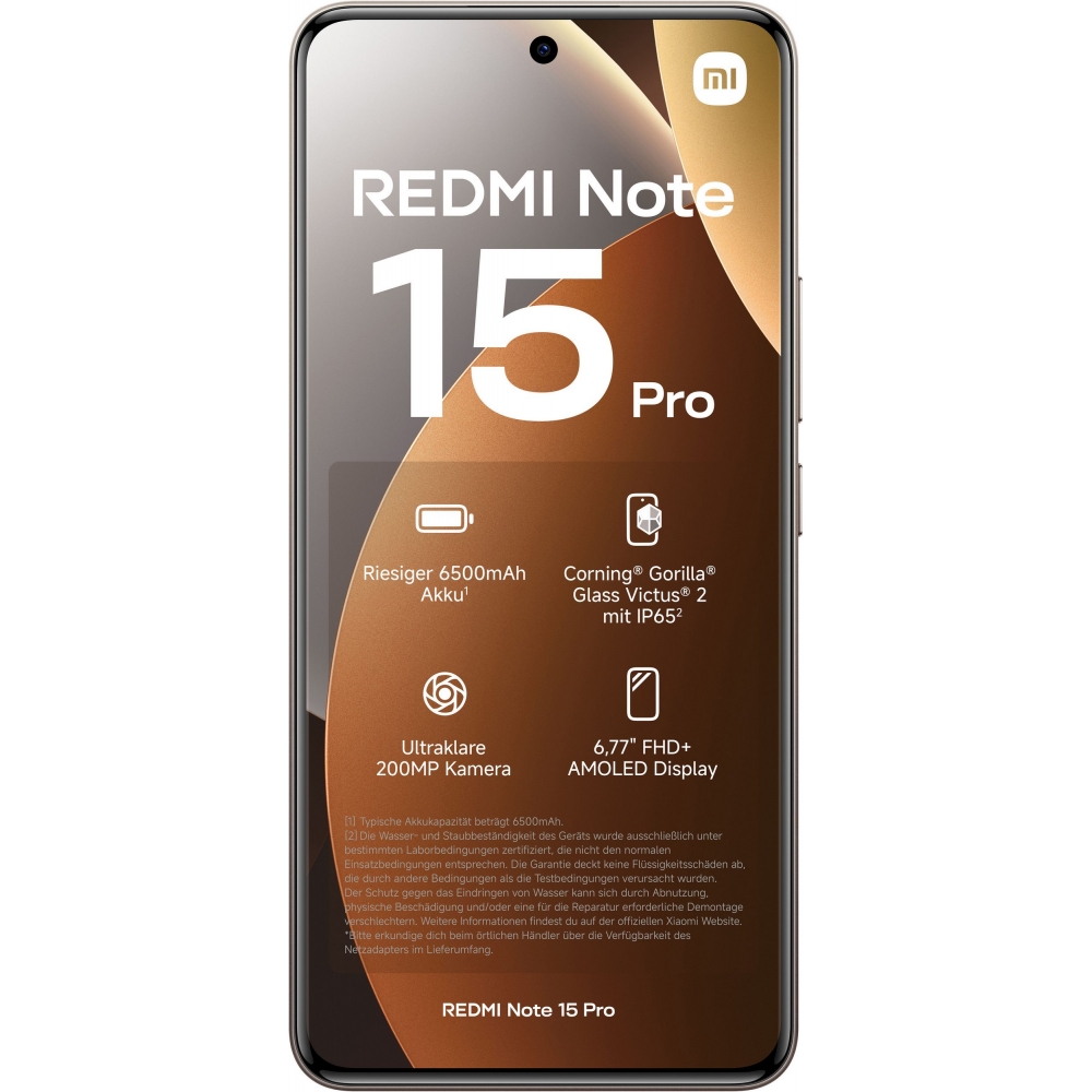 Das Redmi Note 15 Pro kombiniert stabile Verarbeitung mit überzeugendem Design - ein starker Partner für die Anforderungen des mobilen Alltags. Das 17,2 cm (6,77") große AMOLED-Display ist mit hochfestem Glas geschützt und ist mit IP65 besonders gut gegen Feuchtigkeit abgesichert. Im Innern sitzt ein 6500 mAh großer Akku, der reichlich Energie für den MediaTek Helio G200-Ultra Achtkern-Prozessor und bis zu 3200 cd/m² Displayhelligkeit liefert und mit 45W TurboCharge schnell aufgeladen werden kann. Außerdem mit an Bord: Eine 200MP-Hauptkamera erzeugt im Zusammenspiel mit einer 8MP Ultraweitwinkelkamera ultraklare Bilder - für dynamische Schnappschüsse und mit umfassenden AI-Bearbeitungsfunktionen. Die integrierten Lautsprecher sorgen für beeindruckenden Stereosound mit Lautstärke-Boost.